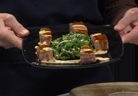 Drizzle a bit of oil in the pan and put over high heat. Meanwhile cut the tuna into chunks and sprinkle with salt and pepper. When the oil is hot place the tuna carefully in the pan to begin to sear. Sear on one side for a minute then turn and put Teriyaki on the cooked side. Sear for an additional minute. Place the seaweed on the center of the plate and arrange the tuna around. Finish with Yum Yum sauce and a sprinkle of sesame seeds.