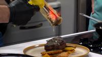 An incredible filet mignon dish with carrot puree and bone marrow butter is being prepared in the Kitchen Concepts Kitchen with Savour Restaur…