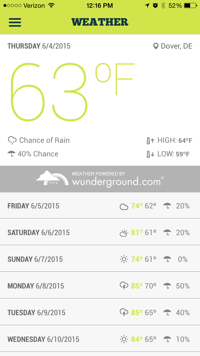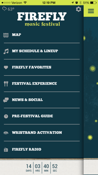 After opening the app, it displays a screen with the logo and a countdown until the festival starts at the bottom, as well as an option to purchase tickets. In the top left corner there are three lines, clicking this will take you to the navigation bar. If you click it the following menu options are displayed: map, my schedule & lineup, Firefly favorites, festival experience, news & social, pre-festival guide, wristband activation, Firefly radio. Also, you can see the temperature displayed in the top left corner of the menu options. If you click the temperature, it takes you to a screen that displays the weather.