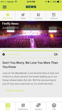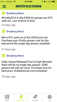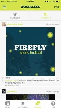 This is an important feature because it gives you the latest news on the festival and shows you what is being posted on social media about Firefly. The news part features articles about the festival. You can connect your Twitter, Facebook, and Instagram to the app to see posts from Firefly. At the bottom of the screen there are three other options: notifications, socialize, and FAQ. The notifications option shows you breaking news updates concerning the festival and the socialize option shows you who is using the hashtag #Firefly2015 on Twitter and Instagram.