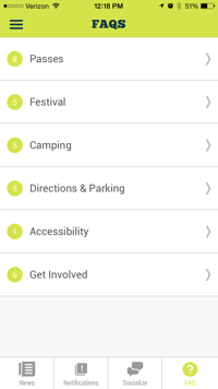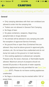 The FAQ’s feature is helpful because it answers popular questions that people may have concerning camping, parking, passes, etc. If you want to know the rules for camping, you can click camping, the question you have about rules, and then the general rules screen is displayed. If you want to know what items are not allowed in the festival area, you can click festival and you will see a list of prohibited items. So if you were thinking about bringing Fido, you might want to find a dog sitter at home before you head to the Woodlands.
