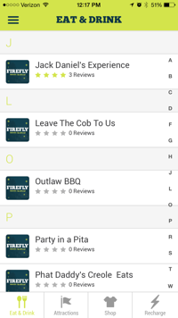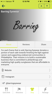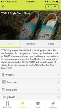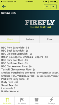 After you click this menu option, the first screen shown is eat & drink. This screen lists all the businesses that are at Firefly where you can purchase food and drink items from. They are listed in alphabetical order so if you are near Outlaw BBQ, you can use this feature to check out what items are on their menu and the prices. Other options at the bottom of the screen include attractions, shop, and recharge. The attractions are listed and you can click on them to learn more about what they are and see reviews. For example, if you click TOMS Style Your Sole, there is a brief description about the attraction and what you can do there. There are also options you can click that will take you to TOMS website and social media. If you choose the shop option, you can see which merchandisers are at the festival. If you forgot your sunglasses, you can check out Barring Eyewear and see the reviews before making your purchase.
