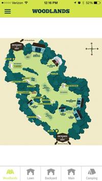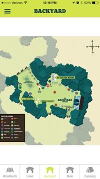 This is where you can see the layout of where everything is taking place for the weekend. At the bottom of the screen, you can select ‘Woodlands’ which is the festival grounds as a whole. Then, by selecting the ‘Lawn’, ‘Backyard’, ‘Main’, or ‘Camping’, shows you closer up views of those areas. This will be convenient when planning out which bands you want to see so you know how far away the other stages is compared to the one you are at now. Also, if you are looking for the restrooms, showers, or maybe you want to relax at the hammock hangout, the map feature will help you out immensely.