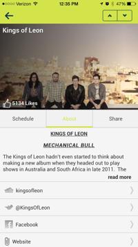 This feature shows you which bands are the most liked that people who have the app have voted on. The top three are The Killers, Cage the Elephant, and Foster the People. If you want to tell the world how much you like a band, click the band name and a page comes up about them. You can see an image of the band at the top of the screen and the likes they have next to a thumbs up in the bottom left corner of the picture. If you want to like the band, simply click the thumbs up and your vote is counted. The other options on this screen are schedule, about, and share. The schedule feature does not work yet because it has not been released at this time. However, that will be where you add this band to your schedule. The about section gives you an overview of the band and you can follow them on Twitter, Facebook, and visit their website just by clicking the options. This feature is pretty neat if you are trying to find out more about a band or if you want to tweet about how you’re so close to the Kings of Leon that you just touched Caleb Followill’s hand. #sodreamy #neverwashingmyhand #Firefly2015