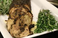7. Allow meat to rest for 20 to 30 minutes. Using an electric knife, slice the meat very thinly. Drizzle the olive oil that has accumulated in the sheet pan over the pork loin. Serve immediately.