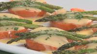 - Place tomato halves on baking sheet and place 2 asparagus spears on top of each tomato.