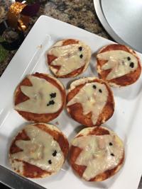 - Spread a thin layer of marinara over bagel and top with cheesy ghost.