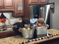 We’re also putting a spin on bobbing for apples. But Corey and Sydney were not aware of the “spin” beforehand. We filled buckets with water and apples and then blindfolded them. But that isn’t the only twist! Tune in at 5 pm to see more!