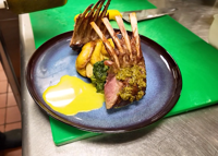 Savour Restaurant enjoying an incredible center cut lamb chop dish with mint chimichurri sauce.