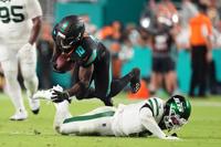 The injury happened on a play where Hill made a catch and got tackled near the New York Jets' sideline with 13:21 left in the third quarter. Players from both teams took a knee while Hill was tended to, and the cart was immediately brought out to help carry him off the field.